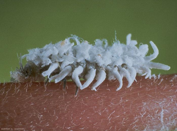 Les larves peuvent mesurer jusqu'à 13 mm. Pour se camoufler et se protéger de leurs potentiels prédateurs, elles miment leurs proies : leur corps est recouvert d'appendices cireux, qui rendent les jeunes larves en particulier difficiles à différentier des cochenilles. Elles ont cependant une couverture de soies bien plus épaisse et sont bien plus mobiles et plus grandes à la fin de leur développement.