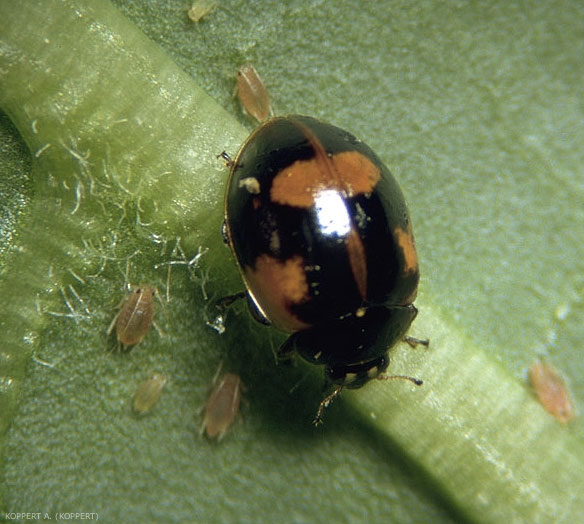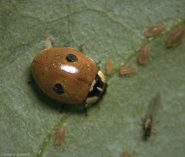 A. bipunctata recherche activement les spots les plus intensément envahis par les colonies de pucerons, contrairement à la plupart des espèces de parasitoïdes, plus adaptés aux faibles invasions. Une association de ces deux types d'auxiliaires est donc souvent conseillée.