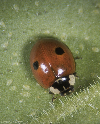 L'adulte d'A. bipunctata est typiquement rouge avec au centre de chaque élytre une tache noire (figures 3 et 4), mais sa coloration est très variable. De nombreux individus sont noirs à taches rouges (figure 5). Ces formes sont dites mélaniques et présentent le plus souvent à 2 ou 4 taches mais il en existe bien d'autres. Ils mesurent 5 à 8 mm de long. Ils sont aptes à se disperser et à s’envoler hors des serres.