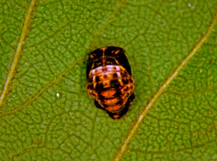 Les stades larvaires 1 et 2 sont gris ou noir, le 3 et 4 ont des taches oranges et jaunes. La nymphe (figure 6) est jaune orangée et mesure 4 mm.