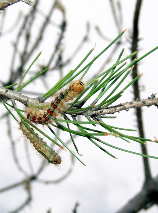Chenilles de Bombyx disparate, Lymantria dispar, sur aiguilles de pin (© INRAE)