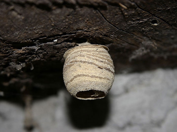 Les fondatrices de frelon européen se réactivent un peu plus tardivement que celles du frelon asiatique. La construction des nids débute au printemps vers les mois d’avril/mai (figure 4). Contrairement au frelon asiatique, les nids de l’année précédente peuvent être réutilisés. Ils sont réalisés en papier mâché, avec une ouverture large vers le bas (figure 5), jamais latérale comme le frelon asiatique. Leur taille n’atteint jamais des proportions aussi impressionnantes que celles du frelon asiatique à l’automne.