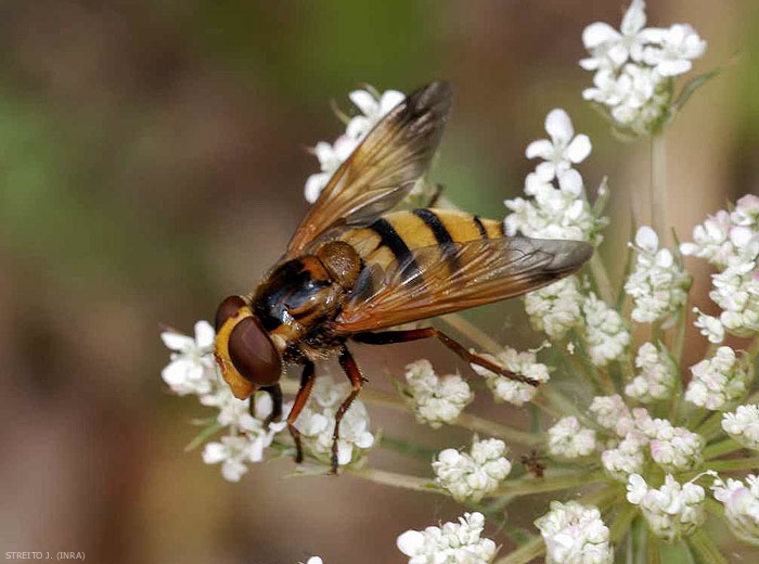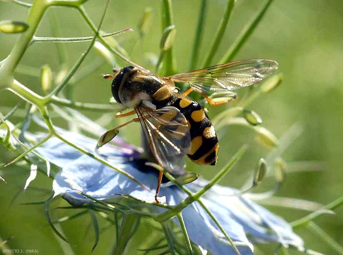 Les syrphes ne font pas partie de l’ordre des hyménoptères, comme les frelons, les abeilles, les guêpes et les bourdons. Ce sont des mouches (diptères) dont les formes et les couleurs peuvent prêter à confusion avec certains hyménoptères, dont le frelon asiatique. Ces mouches se nourrissent du nectar de fleurs et donc participent à la pollinisation. Plus de 5000 espèces ont été décrites.