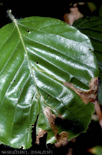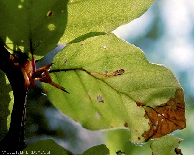 - Les feuilles minées où vit la larve se dessèchent rapidement et prennent une coloration rousse qui dénote avec le reste de la feuille