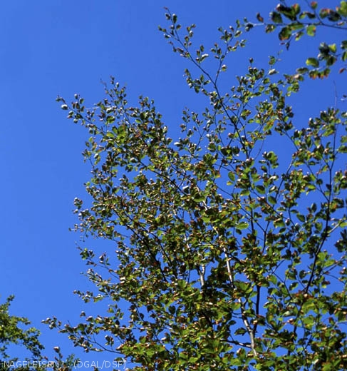 De loin, roussissement du feuillage, qui peut faire penser à dégât de gel tardif.