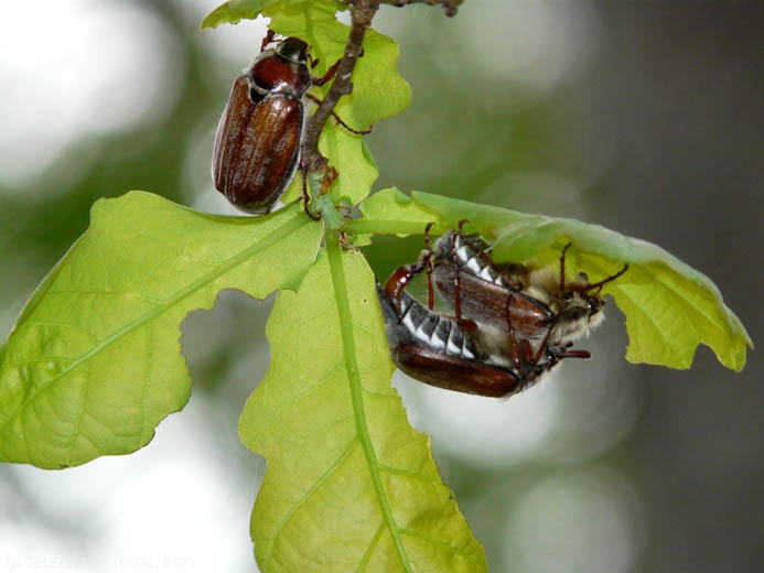 Dommages par les adultes, défoliation des arbres adultes au cours du mois de mai par de gros coléoptères.