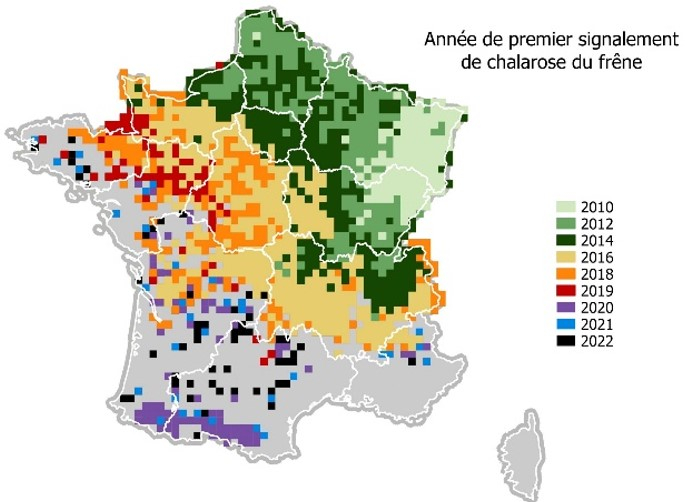 Hymenoscyphus fraxineus (synonyme Chalara fraxinea) est un champignon ascomycète responsable de la chalarose du frêne. Ce pathogène est invasif en Europe depuis les années 1990. Il est originaire d'Asie de l'Est où ses hôtes indigènes sont le frêne de Mandchourie et le frêne de Chine. En Europe, le frêne commun et le frêne oxyphylle sont très sensibles à la maladie. De forts taux de mortalité sont observés chez le frêne commun, notamment chez les jeunes arbres, directement imputable à la chalarose. La première mention de la maladie en France date de 2008 dans le Nord-Est. La chalarose s'est ensuite propagée vers l'ouest et le sud à une vitesse d'envion 60 km par an (figure 1). Seuls les frênes présents dans le pourtour méditerranéen ne sont pas malades, en raison d'un climat chaud et sec en été peu propice à l'infection des rameaux. A l'inverse des deux autres espèces indigènes au Europe, le frêne à fleurs (Fraxinus ornus) présente une bonne résistance à la maladie.