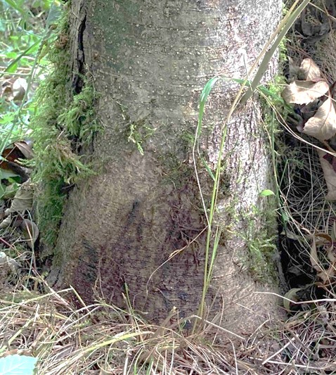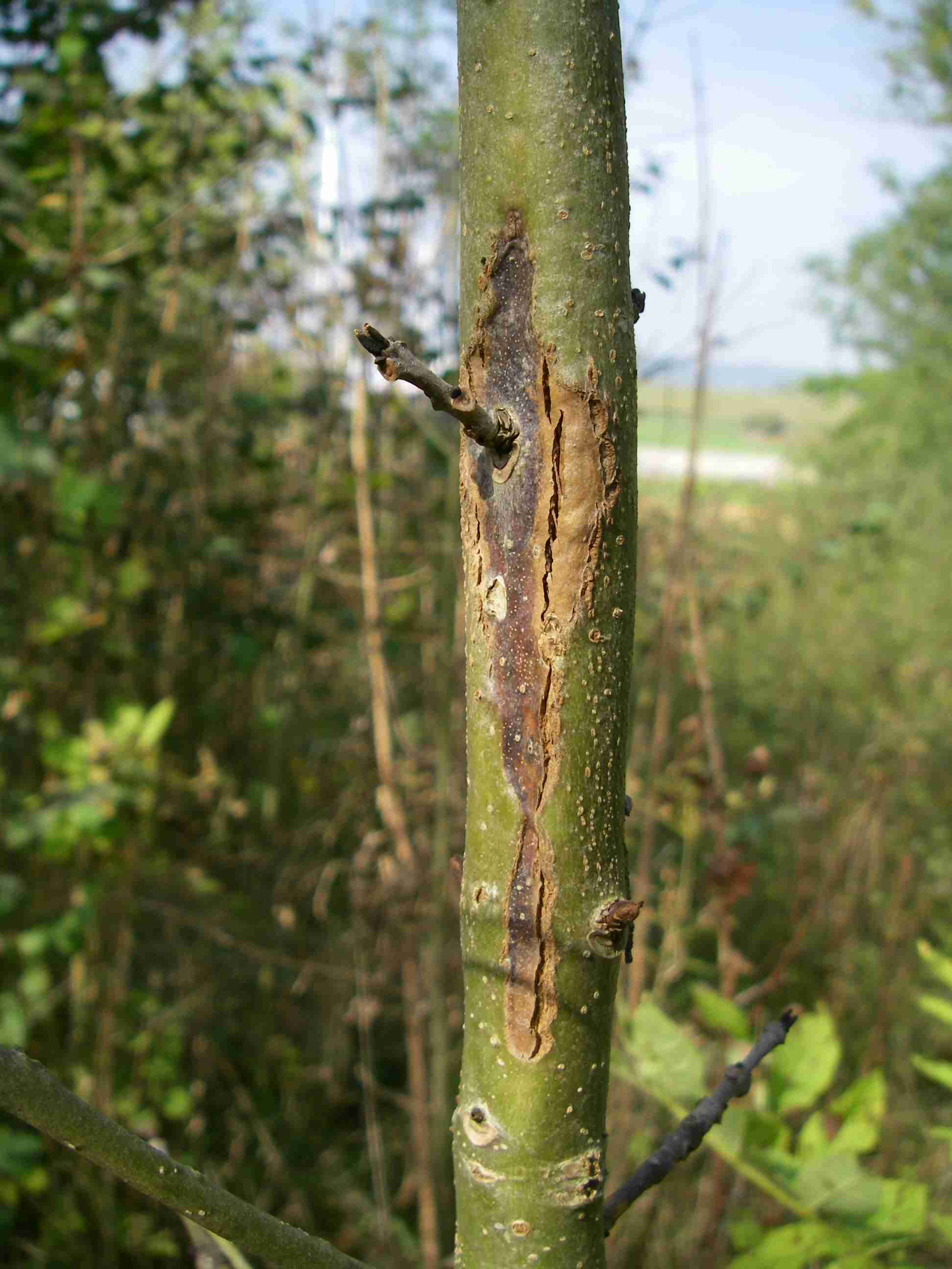 Les nécroses au collet sont visibles sur les arbres sub-adultes ou adultes dans des frênaies denses et très infectées. Elles sont le signe d'un stade très avancé de la maladie et d'une grande vulnérabilité des arbres.