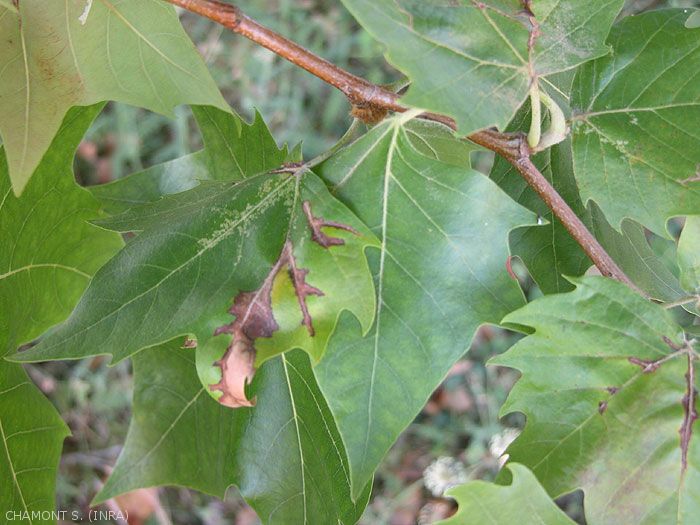 - Plages nécrotiques brunes périnervaires sur feuilles essentiellement au printemps