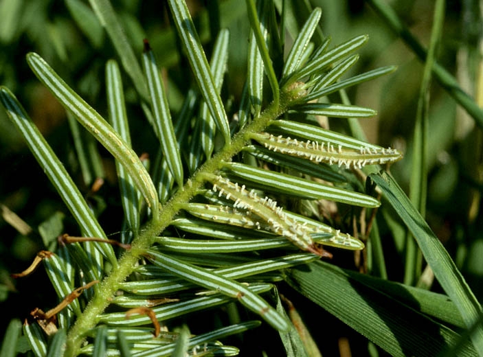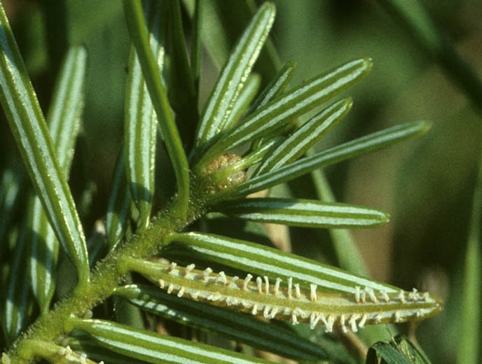 - Sur sapin : sur la face inférieure, présence de petits "tubes" de couleur blanchâtre, qui se colorent rapidement en orange