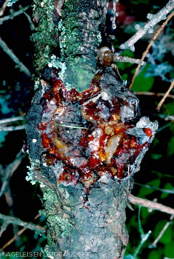 - Présence de chancres sur tronc et branches d'où la résine s'écoule