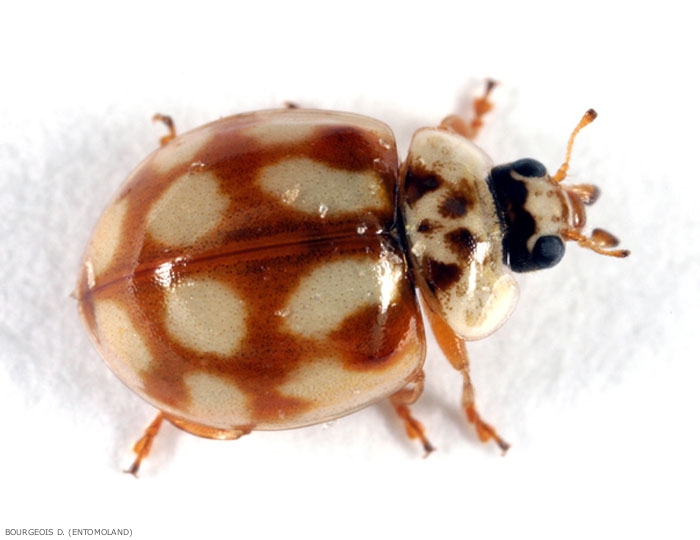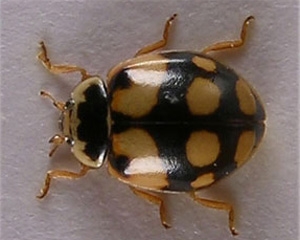 - La forme Decempunctata, la plus commune (figure 1, 2, 3) : le fond est soit rouge, soit orange-jaune, soit brune avec 0 à 12 taches distinctes sur les élytres.
