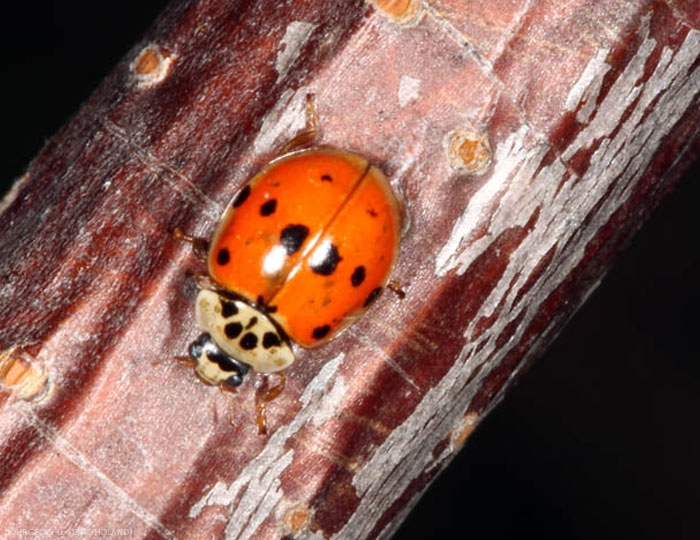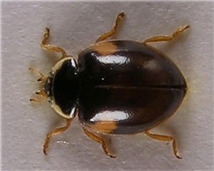 - La forme Bimaculata (figure 5), est une forme mélanique (i.e. plus sombre), avec un fond noir-rouge orné de 2 larges marques jaune-orangées sur les élytres sous le thorax.