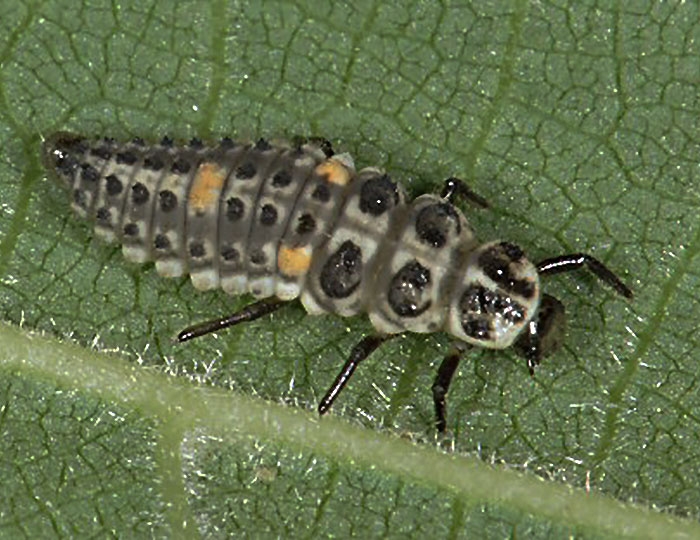 Les larves (figure 6) sont gris-clair avec des points jaunes et blancs, d'une taille allant de 5 à 6mm.