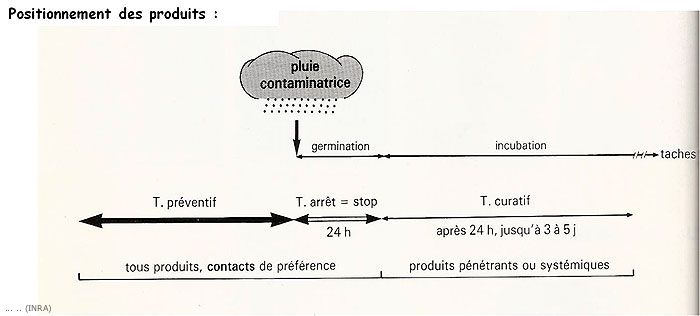- en curatif, avec un produit de la famille des IBS (Inhibiteurs de la Biosynthèse des Stérols), 3 à 4 jours après le début de la pluie contaminatrice selon le produit.