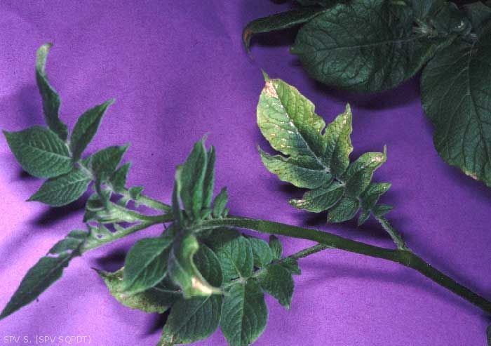 Certains isolats de ce viroïde peuvent induire de fortes déformations foliaires sur des plants de tomate cultivés à des températures autour de 25 °C (figure 4).