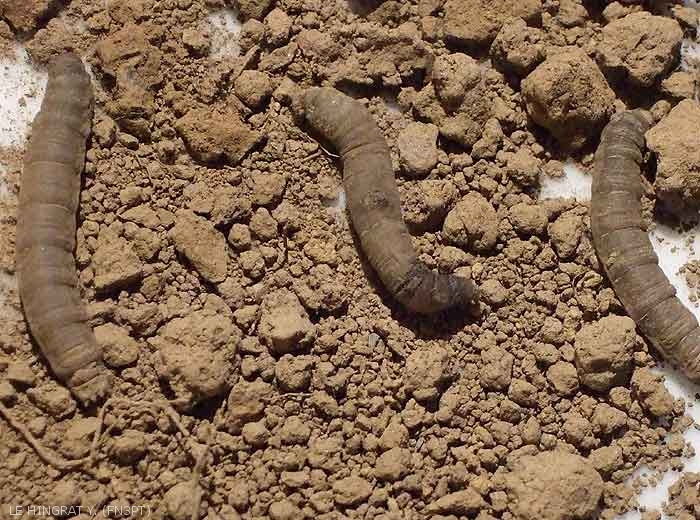 Les larves des tipules (leatherjackets ou maggots en anglais) (figures 2 et 3) sont de couleur gris terreux, avec une peau épaisse et caoutchouteuse et un corps d’une longueur de 3 à 4 cm. Elles ont des parties buccales mordantes et un corps sans patte mou mais très résistant, qui peut s’allonger et se rétracter facilement et fortement.