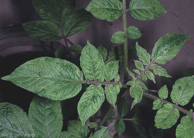 Les plantes atteintes de tomate montrent des taches jaunes sur les feuilles, des chloroses internervaires légères et dans certains cas des déformations foliaires.