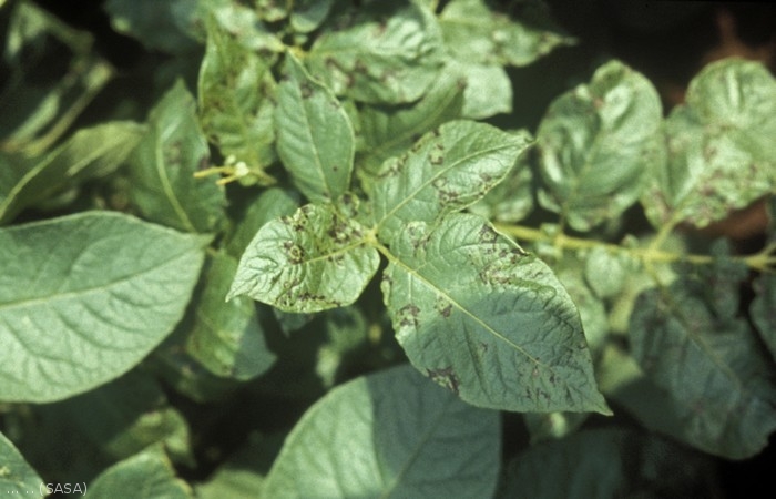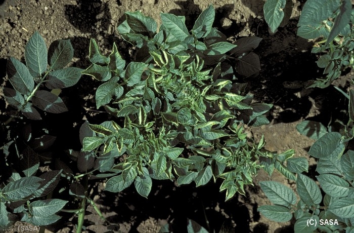 Sur les feuilles, les infections primaires peuvent se traduire par des anneaux et des taches nécrotiques (figure 1) et les infections secondaires par des déformations des feuilles (formes effilées, enroulement…) accompagnées de nécroses et parfois d’une forte réduction de croissance des plantesh (figure 2).
