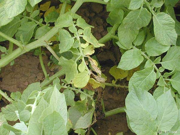 Les symptômes en végétation commencent généralement d’un côté de la plante ou de la feuille (figure 2) par une chlorose débutant entre les nervures des feuilles qui évolue ensuite en nécrose jusqu’au dessèchement ou flétrissement du feuillage.