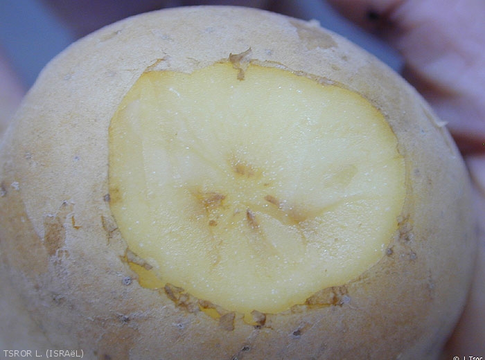 Les tubercules atteints présentent des taches brunes au niveau de l’anneau vasculaire (figures 5 et 6) et peuvent avoir une taille réduite.