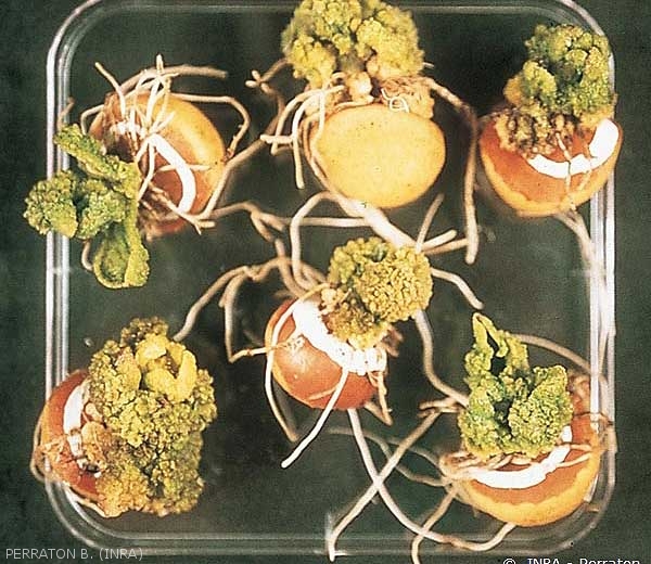 Elles ne se forment jamais sur les racines à la différence de la gale poudreuse ou des nématodes à galle. Les tumeurs, d’abord blanchâtres, noircissent au contact de l’air (photo 2) et libèrent une poudre noire de spores. Elles peuvent verdir si elles sont exposées à la lumière (photo 3).