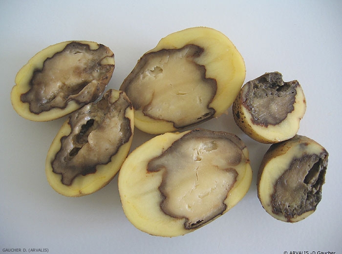 Les Pythium causent une pourriture humide et grise au départ, puis qui brunit au contact de l’air et dégage une légère odeur de hareng. La texture des tissus atteints est relativement fluide, voire crémeuse et les tissus sains et malades sont nettement séparés. Les symptômes peuvent évoluer tant que le séchage n’est pas suffisant (figures 1, 2, 3 et 4).
