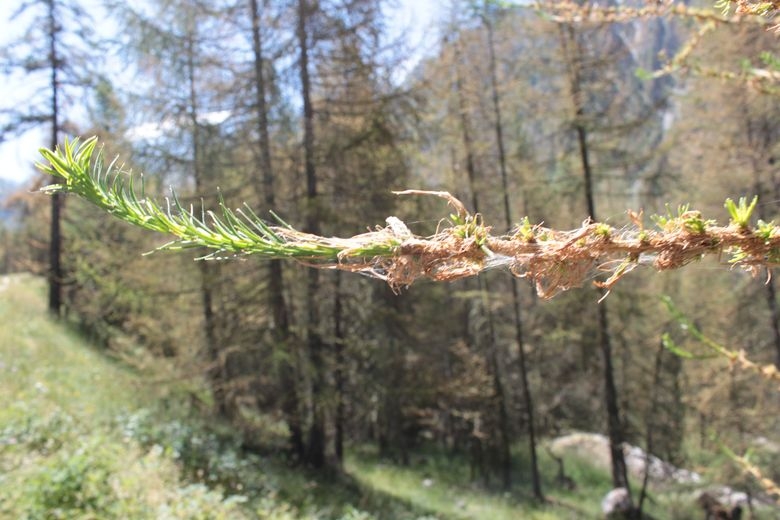 Les attaques se développent entre 1700 et 2000m (optimum vers 1850m). Les peuplements de mélèze attaqués prennent un aspect brunâtre ou rougeâtre à partir de juin. Sur rameaux attaqués, présence de petits fourreaux constitués d'aiguilles assemblées par des fils de soie et dont l'extremité est consommée. Courant juillet, les arbres portent des tissages abondants sur lesquels les déjections des chenilles restent accrochées.