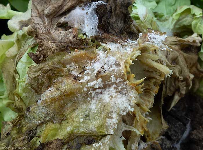 - Mycélium plus ou moins blanc plus ou moins persillé se formant sur tous les tissus affectés ;