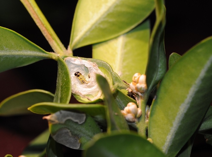 Dès leur éclosion, les jeunes chenilles vont se nourrir avec leurs mandibules à la surface de la cuticule et de l'épiderme supérieur ou inférieur des feuilles de buis (figure 1). Ces dernières ainsi "grignotées" vont très vite se dessécher et blanchir. Les chenilles plus âgées attaqueront l'ensemble de la feuille pour se nourrir (figure 2). C'est ainsi que les buis prennent une apparence de dentelles.