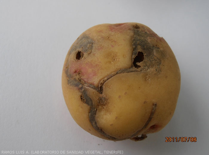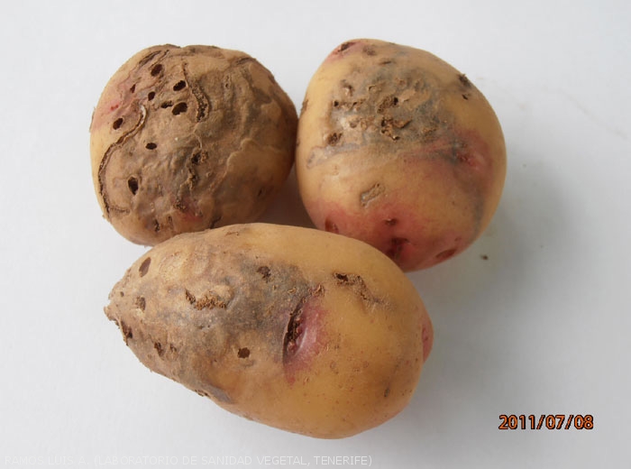 L’adulte est un petit papillon (figure 1) de couleur brun clair (avec une envergure des ailes de 15 à 2 mm) mais c’est le stade larvaire (figure 2) qui est le plus dommageable par les galeries que les larves peuvent creuser en surface des tubercules de pomme de terre (figures 3 et 4).