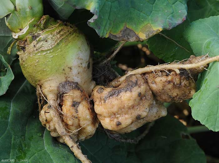 - Description : excroissances, renflements sphériques à allongés, localisés surtout sur les racines, parfois le collet de nombreuses cultures légumières.