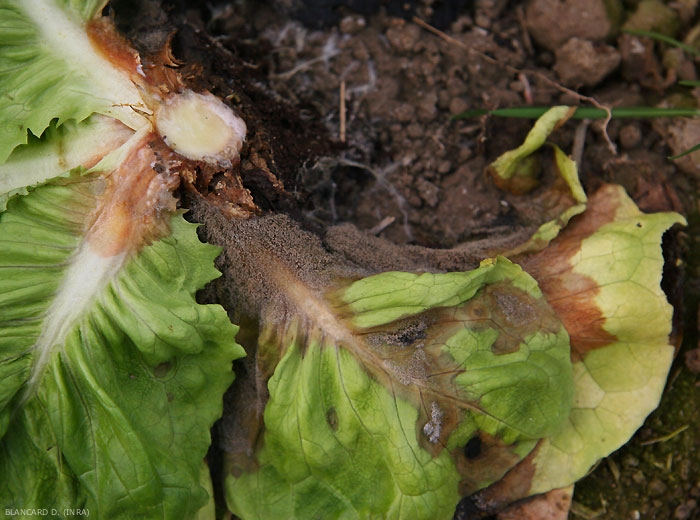 - lésions, pourritures plus ou moins humides, brunes à noires, ceinturant le collet (figures 1 à 5) : plusieurs champignons et Oomycètes telluriques (Rhizoctonia solani, Sclerotium rolfsii, Sclerotinia sclerotiorum, Botrytis cinerea, Didymella spp., Pythium spp., Phytophthora spp., etc.), un excès d'eau, etc. ;
