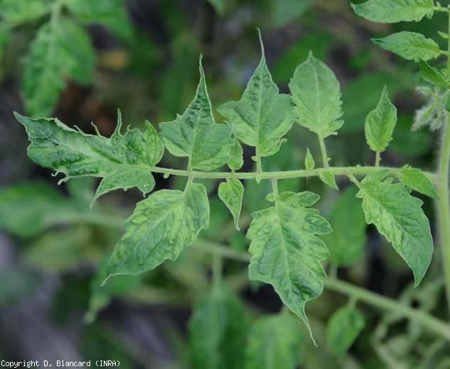 - Description : alternance sur feuilles de zones de coloration vert pâle ou vert foncé et de zones chlorotiques ou jaunâtres. Lorsque la mosaïque est de faible intensité et diffuse, on parle de marbrure (mottle) ; la panachure désigne une mosaïque bien marquée avec une alternance des plages aux couleurs différentes et aux contours nettement définis. Sous l’appellation mosaïque sont aussi regroupés une multitudes de symptômes souvent associés aux viroses : taches annulaires, arabesques, lésions digitées ou en forme de feuilles de chêne...