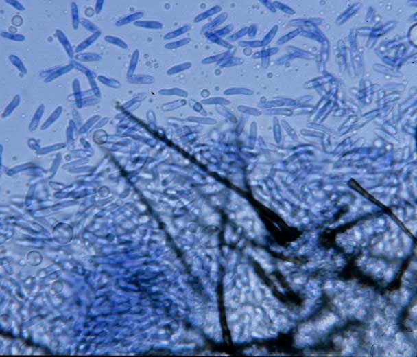 • Conseils : au laboratoire, l'observation des conidies présentes sur les tissus végétaux altérés ne pose normalement pas de problème. Repérées grâce à la loupe binoculaire, elles peuvent être détaillées après préparation microscopique entre lame et lamelle et observation au microscope photonique. Si elles sont absentes, placer les échantillons dans une chambre humide et réaliser des observations à intervalles réguliers.