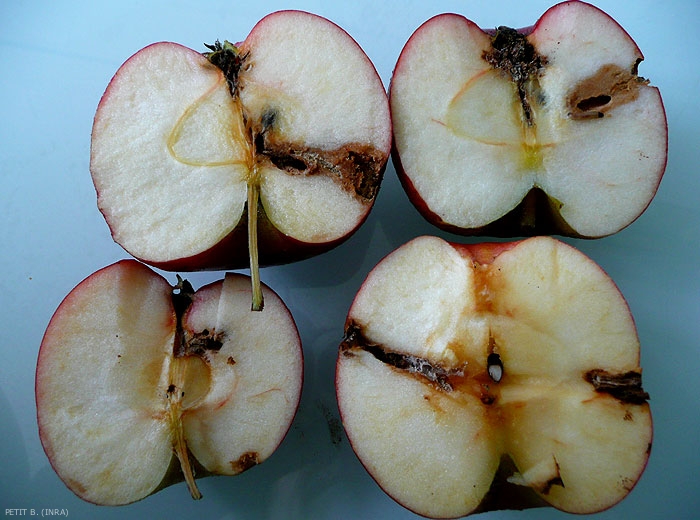 La larve se dirige vers la cavité carpellaire et s’attaque aux pépins (figure 3), ce qui provoque la chute du fruit (caractéristique du carpocapse).