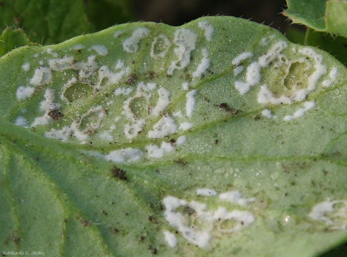 • Description : petites pustules surtout foliaires, sous épidermiques et d'aspect nacré, mesurant quelques millimètres de diamètre. Elles ont tendance à se concentrer et laissent apparaître à maturité une poudre blanche.