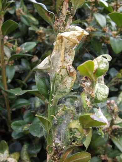 Le plant attaqué est généralement entouré de fils de soie, dans lesquels se trouvent des chenilles et leurs déjections.
