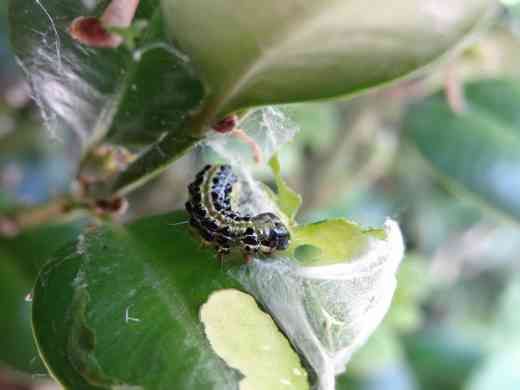 Le buis attaqué est progressivement défeuillé sans qu’aucune feuille ne se retrouve au sol. Les vestiges de feuilles présents sur l’arbuste présentent des découpes dues aux chenilles. Les derniers stades larvaires sont assez gros pour être facilement visibles à l’œil nu.