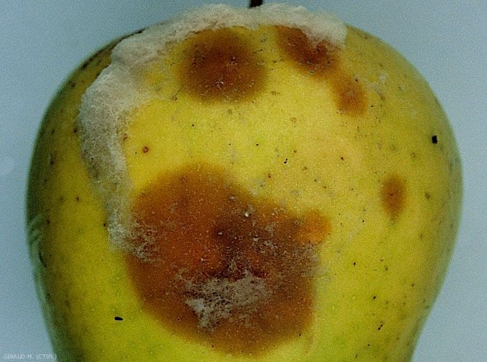 Le Botrytis de l’œil évolue rarement vers une pourriture généralisée. En conservation le Botrytis se présente comme une pourriture brune (figure 2), en général molle et humide (qui peut être cependant mais rarement très ferme). Elle apparaît en général dans les premiers mois de stockage. Les lenticelles sont parfois auréolées de brun rouge.