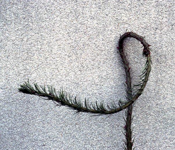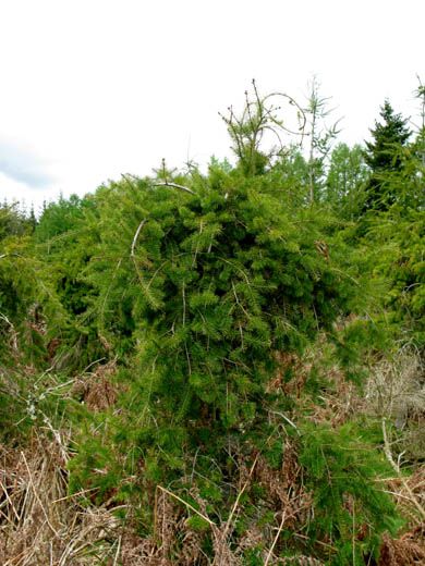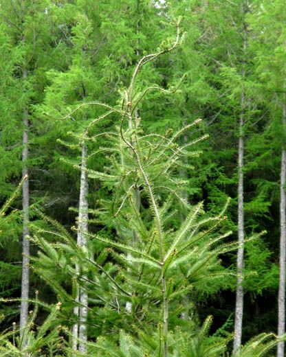 Les symptômes de carence en cuivre sur douglas provoque des courbures de la pousse terminale.
