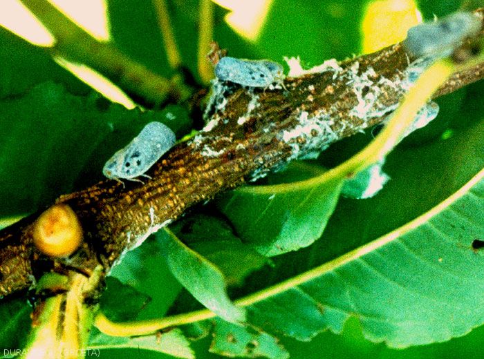 A partir de la fin du mois d’août, les adultes (figure 1) pondent des œufs, forme hivernale du flatide pruineux, dans les anfractuosités des écorces. Les éclosions qui débutent en avril ou mai sont très échelonnées.