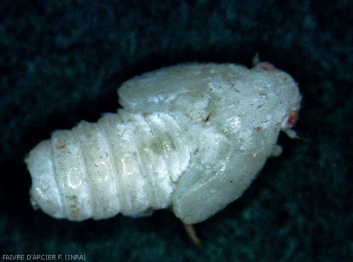 Les larves sont blanches, aplaties et recouvertes d’une cire protectrice blanche et filamenteuse qu’elles sécrètent (figure 2). Les larves passent par cinq stades successifs de développement et mesurent de 1 à 7 mm selon le stade.