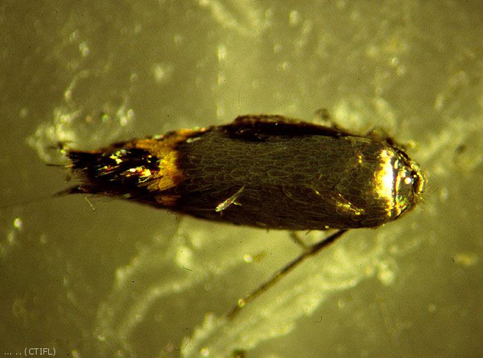 L’adulte mesure six à huit mm. Il est gris métallique avec des antennes longues de trente-deux articles (figure 1). Les ailes sont de couleur gris clair métallique, avec des taches blanches à l’extrémité, entourées de liserés jaune doré ; les franges alaires sont très développées.