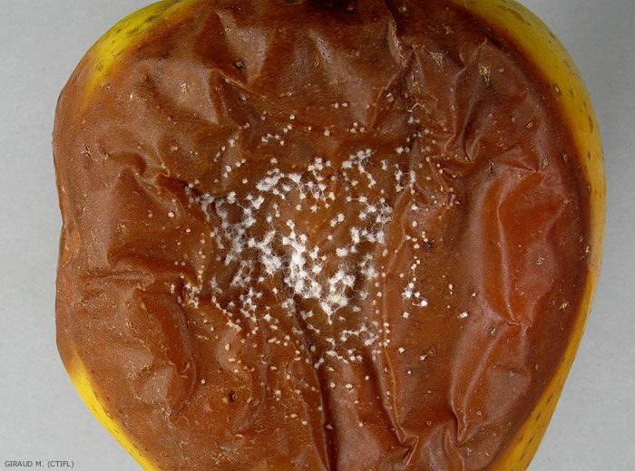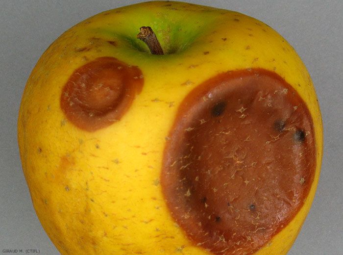 Pourriture lenticellaire, caractérisée par des nécroses circulaires, à contour net, rondes ou ovales, marrons uniformes ou parfois un peu plus claires au centre (figures 1 et 2). Les premiers symptômes apparaissent en général à partir de décembre – janvier (froid normal) ou à partir de février – mars (atmosphère contrôlée). En conditions humides, des ponctuations blanches (pycnides), devenant parfois en vieillissant marron-caramel, apparaissent sur les nécroses (figure 3) et, par la suite, un feutrage blanc peut se développer, les recouvrant plus ou moins (figure 4). Elles contiennent des spores de forme arquée. La nécrose évolue en pourriture molle, s’affaissant au centre.