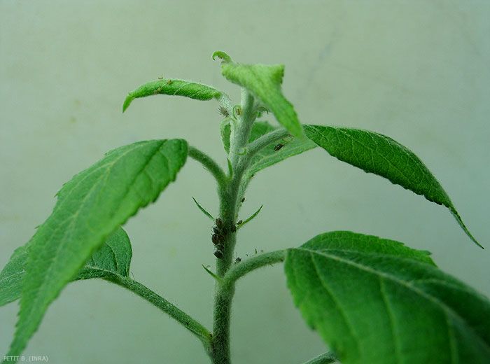 Les colonies importantes (figures 1, 2 et 3) provoquent l’enroulement et la déformation des feuilles (figures 4 à 10) et des rameaux (pseudo-galles).