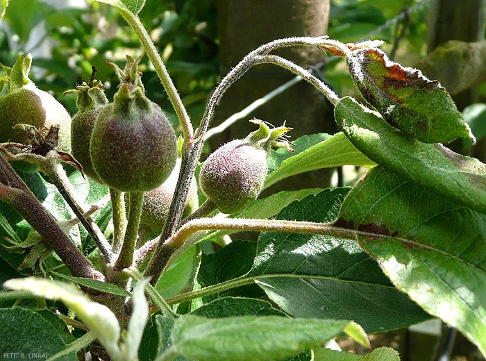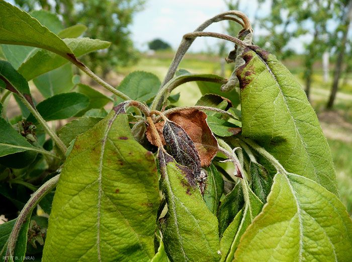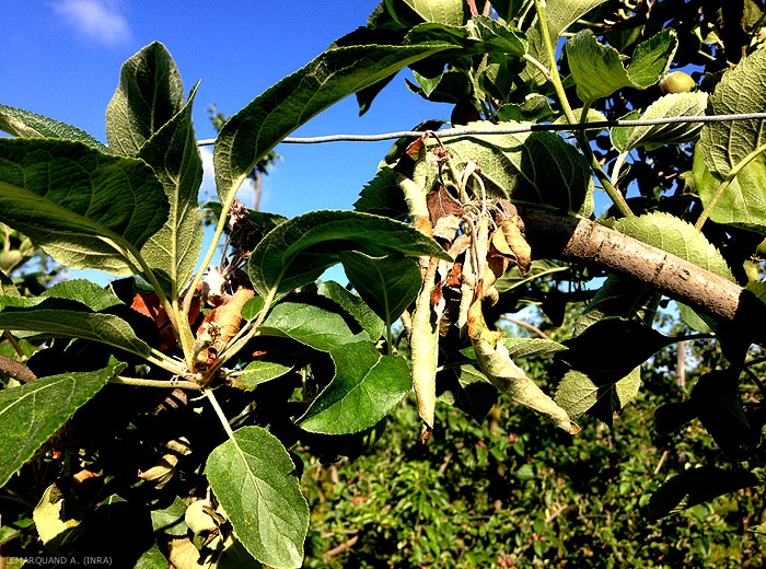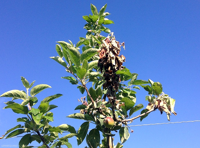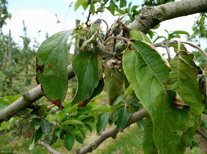 Fleurs, fruits et feuilles restent fixés sur l’arbre et les jeunes fruits se momifient. La progression de la nécrose vers des organes plus âgés et la formation de chancres de la périphérie vers la base de la plante peut être redoutable chez le pommier et le poirier, il dépend vraiment de la sensibilité variétale.