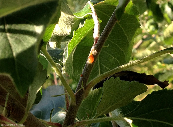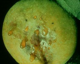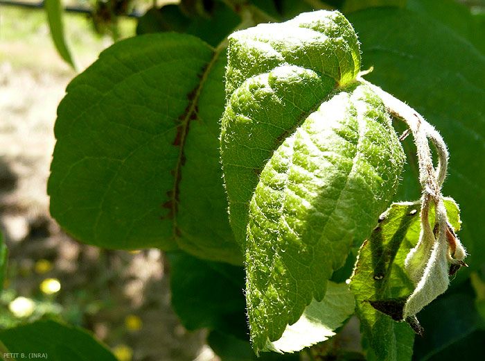 Les premiers symptômes apparaissent au printemps sur fleurs puis sur pousses. Le premier symptôme caractéristique est la production d’exsudat, gouttelettes liquide blanc ou jaunâtre puis ambré et collant (figures 1 à 3), signe d’un développement massif de populations bactériennes dans les tissus atteints.