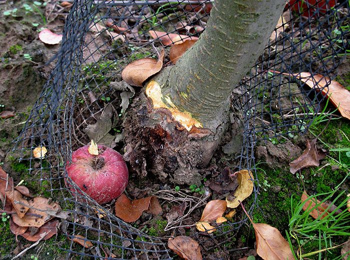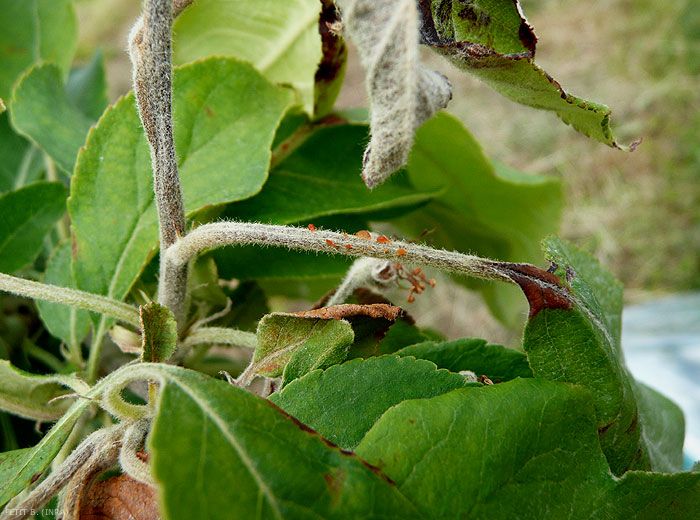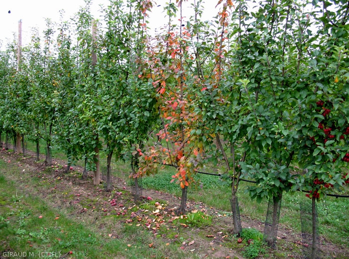 Le Feu bactérien peut atteindre le porte-greffe, où il forme un chancre pas toujours facile à voir, car proche du sol, et souvent noyé dans les broussins. Dans ce cas le symptôme caractéristique est celui d'un rougissement du feuillage à l'automne, suivi du dépérissement de l'arbre, sans symptôme apparent sur les rameaux et pousses (figure 13), en particulier si la variété est tolérante. Les porte-greffe de la série M9 sont très sensibles.