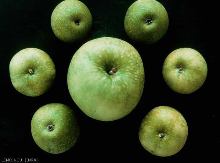 Golden Delicious figure parmi les variétés les plus sensibles, avec les cultivars tétraploïdes.